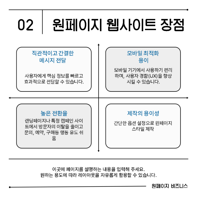 - 쉬운 제작 및 관리: 복잡한 페이지 구조가 없어 제작 시간과 비용을 절감할 수 있습니다